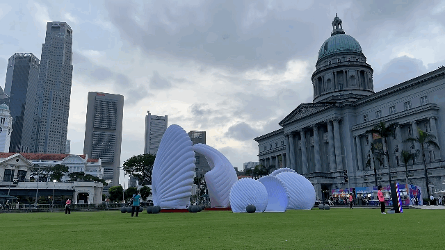 This work consists of six large sculptures resembling tropical palm trees, and is an air sculpture created against the backdrop of an urban landscape.